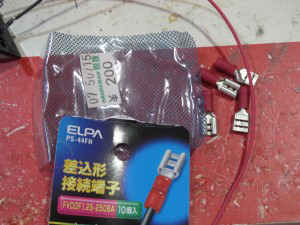 これに赤い線と黒い線をはんだ付けします。その前に接続端子の赤いビニール(?)の部分が少し邪魔なのでニッパーで切って使っています。