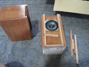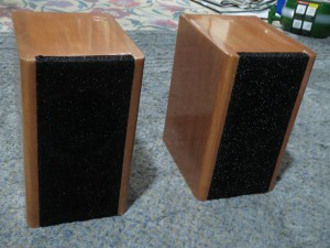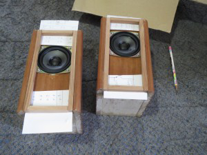紙で養生して、ボンドでくっつけます。もちろんフレームだけですよ。スピーカーボックス側にボンドが垂れないように必ず紙で養生してください。これもボンドが固まるまでフレームの形をきれいにまとめてください、うまくやらないとフレームが微妙にひし形になることがあります。この微妙な斜めは人間の目にはすぐわかります、最後まで手抜きは禁物です。