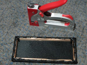 それでは前面にはめ込む布を張るためのフレームを作りましょう。1㎝角(写真は9㎜角だったと思います)程度の角材を買ってきます。これを切ってフレームになるようにします。布を張るのでそのマージン分をやや小さく作る必要がありますが、ゆるゆるになるよりはきちきちのほうが良いと思います。その辺はご自身の裁量でお願いします。