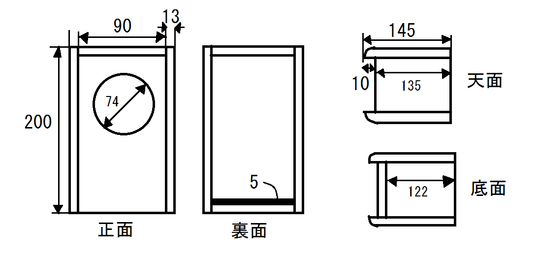 こんな感じで作ってみました。エアダクトは裏板の下のほうの隙間です。どれくらいにすればよいかわからないので5㎜にしてみました、ボックスが小さいのでこれ以上大きいとスカスカになるような気がしますが、よくわかりません。バッフルと天板は5㎜程長めにして組み上げてから切ったほうがきれいになるかもと思って、長めに切りました。上の寸法図はぴったりの寸法です。お好みで長めにしたりしてみて下さい。