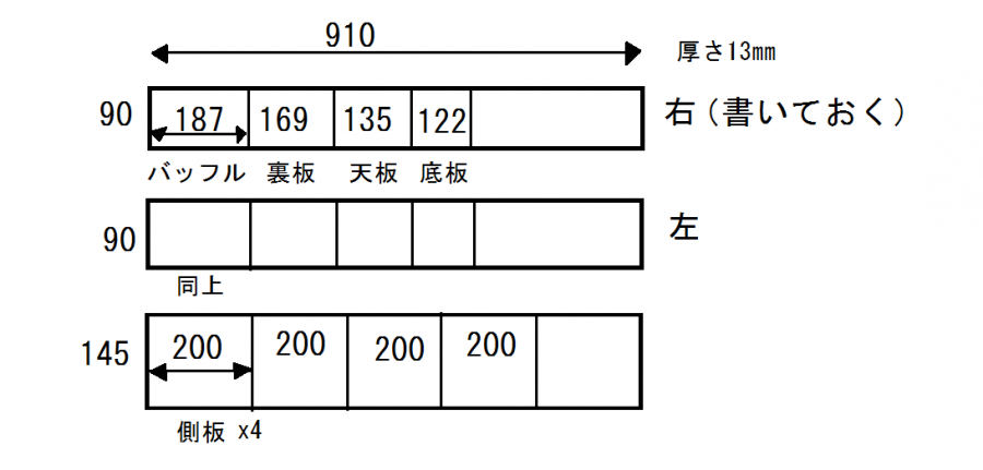 市販の板は1枚1枚微妙に幅が違います、できるだけ1枚の板で一つの箱を作るようにしましょう。後でどっちかわからなくなるので、必ずそれぞれのパーツの裏に右とか左を書き込みましょう、右左は字が似ているので間違いやすいです、1と2とか○と×とかのほうが間違えないかも。特に字の汚いよいこはわかりやすい記号にしましょう。