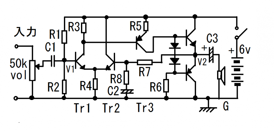 次に2段目のトランジスタのエミッタ抵抗R5を決めましょう。バイアスが6-1=5vになります。これがエミッタ電圧になるときはPNP型なので0.6v上がることになるので5.6vです。つまりR5には0.4vの電圧がかかることになります。ここには毎度おなじみの10mA以上の電流が欲しいので、40Ω以下が良いです。でもできればTr3の倍率も100倍くらいはほしいです。R5を40オームにしたとします、するとR6はその100倍の4kになってしまいます。これではとても10mAを流す事はできません。逆にR6から考えましょう。出力部の電圧が3vとすると、R6には0.6v下がって2.4vがかかることになります。10mA以上流すためにはR6は250Ω以下です。よってR6=240Ωにしましょう。するとR5はその1/100の2.4Ωになります、これも前の4石負帰還アンプ同様2Ωにしましょう。