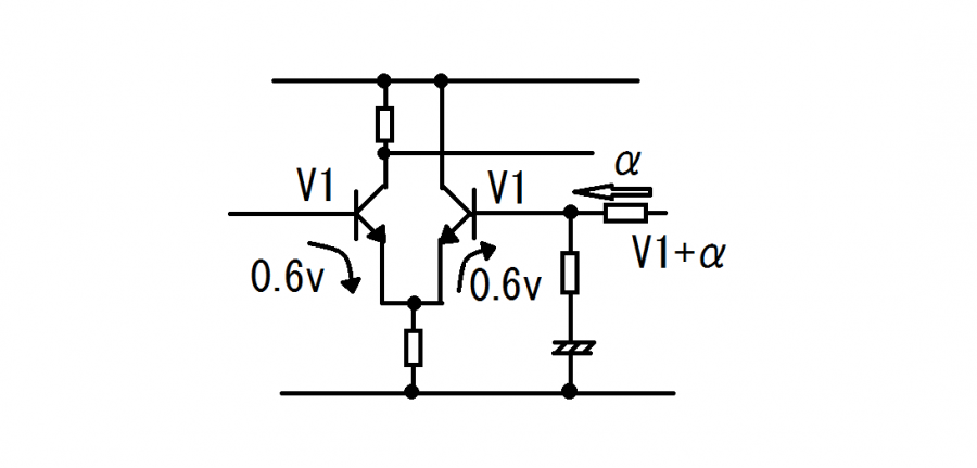 もう一つ差動回路には重要な性質があります、これが差動の差動たるところなのですが、左右のトランジスタの入力の差が増幅されるという性質です。これもいろんな本にいろいろ説明してあります。とにかく左右に同じ信号が入力されれば差がないのでなにも増幅されません、逆の信号が入力されれば2倍になります。今回は右側のトランジスタに同相の負帰還信号がかかりますから、その分が差し引かれて増幅されることになります。とにかくそういうもんだと考えれば非常にわかりやすいというか使いやすい回路です。