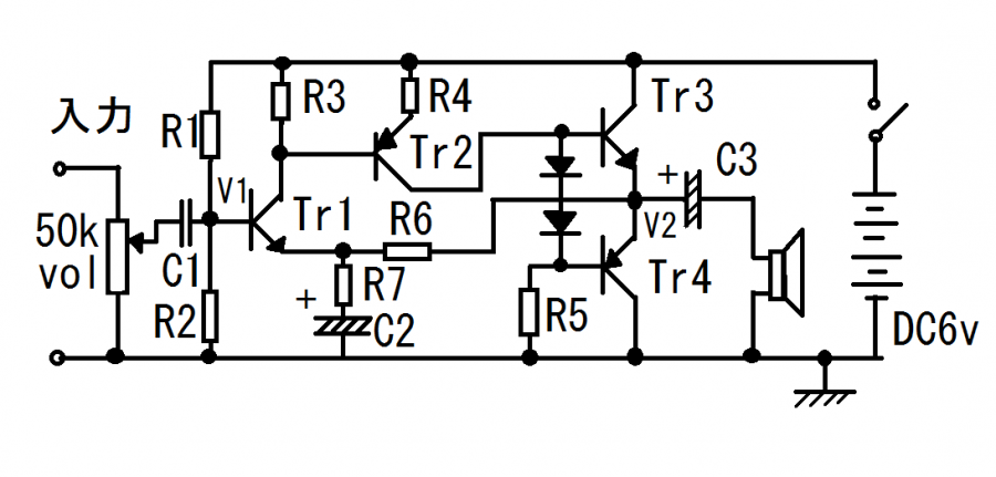 ここでなんでこの回路じゃないといけないのか?という疑問を持ったりしてはいけません、例えばTr2をNPN型で組んでみる手もありだとは思いますが、すると初段と2段がNPN型になるのでちょっと電圧配分がやりにくくなると思います。どうしてもこのお仕着せの回路がいやという人はそういうのも考えてみるのもいいと思います。