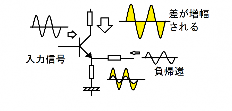 負帰還はDC帰還で初段のトランジスタのエミッタにつながっています。エミッタに戻すというのはどういうことか?これもややわかりにくいですが、同相の信号をエミッタに戻すとエミッタの基礎的部分がこの信号で上下に振れることになります。したがってベース電圧とエミッタ電圧の揺れの差の分だけがコレクタで増幅されることになるのです。ちょっとわかりにくいですが、図に書くとこんな感じかなと思います。