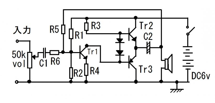 R5とR6で上の回路のように戻します。R5はわかるのですが、R6の位置はこれでいいんかい?という感じがしますが、これは結局C1を通ってボリュームに流れてアースされていくようです。したがって、細かく言うとこの負帰還はR5とR6とボリュームのアース側の抵抗を足した分で分圧されることになります。つまりβ=(R6+ボリュームのアース側の抵抗)/(R5+R6+ボリュームのアース側の抵抗)ということになるようです。つまりボリュームの位置によって負帰還量が変わることになります。なんかしっくりきませんが、とにかくこうしかできないのでこれで実験しましょう。