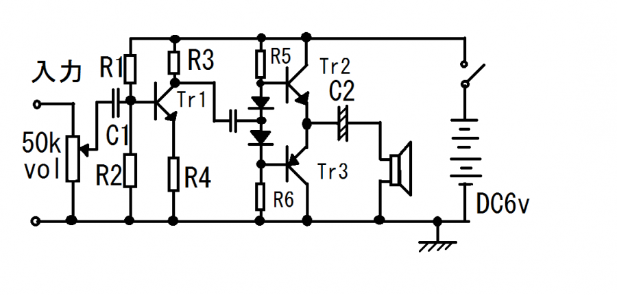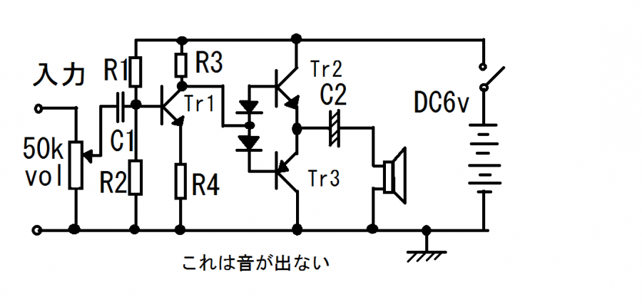 まず上の図のように単純に初段のエミッタ増幅回路とコンプリメンタリP-P(プッシュプル)回路をくっつけてみました。しかしこれでは音が出ませんでした。Tr1のコレクタ電圧が2個のダイオードの間に入って、それがベースバイアスになるはずですが、もしかするとそこがうまく行ってないのかなと思って、本に書いてあるようにバイアスをかけて入力をコンデンサで交流成分だけにしてみました。これなら本に書いてあるので音は出るはずです。