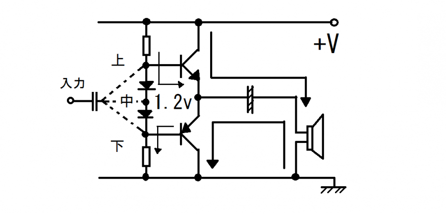 このエミッタフォロア回路は難解です。よく考えると意味不明な部分が結構あります。例えば上のトランジスタから吐き出された電流は当然スピーカー側のコンデンサをチャージしますのでそちら側に流れますが、おそらく下のトランジスタにも流れると思うのです。で、その逆のコンデンサから逆流してくる電流は上のトランジスタには流れないので、やはり行きと帰りで若干違う信号の流れになるような気がするのですが、どうなんでしょうか?。実際に出来上がった回路でこの2個のトランジスタを触ってみると下のトランジスタのほうが熱くなっているように感じます(指で触った感じです、温度は測ってません)。つまり上のトランジスタより電力を消費しているということだと思いますが、よくわかりません。