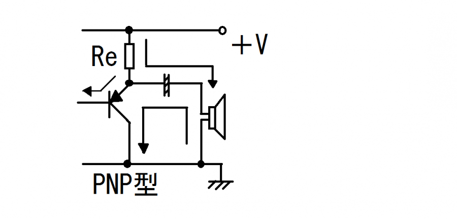 トランジスタをPNP型にして、電源のプラス側にエミッタが抵抗を通してつながれています。トランジスタを流れる電流の流れがNPN型の逆になり、ベース電流もトランジスタから流れ出るような電流になります。この逆方向にはトランジスタの性質上電流は流れません。信号の電圧より0.6v高い電圧がエミッタ側に現れます。信号電圧が高くなる時はその分がコンデンサにチャージされるはずですから、その分の電荷の移動があるので電流が流れて、スピーカーにも電流が流れますが、その時電流はReを通ってくるしかありません(トランジスタ側からは流れてこない)。しかしReには電源電圧から信号電圧+0.6vの電圧を引いた分の電圧がかかっていて、その分の電流が流れるはずです。その電流がベース電流として少し流れ出して、残りがコンデンサにチャージされることになると思います。