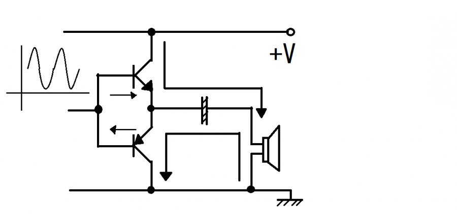 NPNとPNPのトランジスタを上下につないだ形です、お互いのReの部分に相手側のトランジスタが入っています。信号電圧が高くなる時はエミッタの電圧も高くなるのでコンデンサをチャージしますから上側のNPN型トランジスタしか働きません、下側のトランジスタはPNP型ですからコンデンサをチャージする方向には電流が流れません。したがって信号が高くなる時は上側のトランジスタのみ作動します、逆に信号が下がってくると今度はコンデンサら放電されますので(コンデンサが電源の代わりになると思えばよいです)、上のトランジスタには電流が流れず、下のPNP型トランジスタのみ作動します。このとき信号電流はベースを通じて上側では流れ込み下側では流れ出します。ということは信号電圧はプラスになったりマイナスになったりしているのかというとそうではありません。ここの電圧はバイアスがかかっていますので常にプラスです。ここがちょっと感性ではわかりにくいところですが、PNP型トランジスタからベースを通して流れ出た電流はそのままこの前の段の回路でアース側に吸収されると考えて下さい。あまり深く考えるとわからなくなります。要はこの回路で、コンデンサを信号の増減に合わせて強力にチャージさせたり放電させたりしているのがエミッタに現れる0.6v差の電圧だと考えて下さい。結局それだけです。