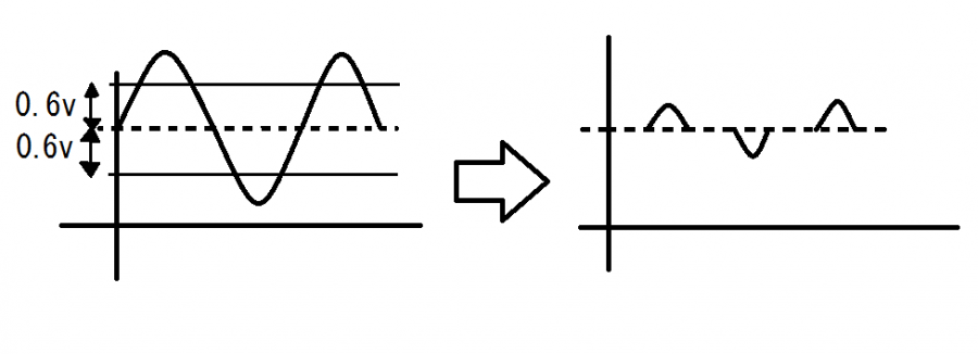 ここがカオスになっています。お互いのトランジスタがお互いを強力にけん制し合ってこの0.6vの呪縛から解き放たれないとトランジスタは作動できません。つまりそれぞれ0.6v信号電圧が高くなった時と低くなった時しか働けないのです。ただしこの理屈は僕の独断の感性の理屈なのでおそらく間違ってますが、話は合うので素人の方はこんなとらえ方でよいと思います。もう少しちゃんとわかってきたら成書を読んで理解して下さい(おそらくわからないと思いますが・・)。このときの波形は下の図のようになるそうです(これはどんな本にも載ってます)。