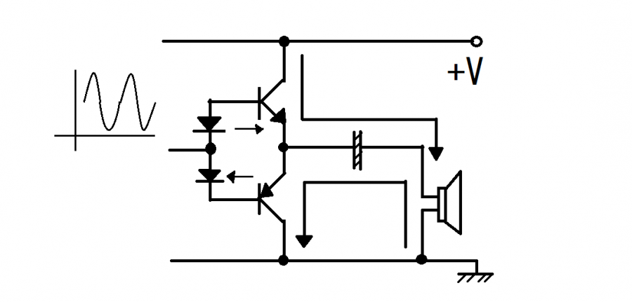 実は僕もPNP型のトランジスタのイメージはなかなか感性でとらえられません。これを書きながらも、よくわからんなーという感じです。ただチャージされた電荷は信号が下がって行く段階ではトランジスタを通ってスムースに流れるのでしょう、これもよくわかりませんが、おそらくNPN型のトランジスタと反対のことが起こっているはずなので、そうなるのではないかと思います。感性でとらえやすいのはNPN型のほうなので、ある程度理解したら、あとはその逆になるんだよ程度でよいかもしれません。真空管ではこの逆の流れというのがあり得ないので、これからお話しするコンプリメンタリプッシュプル回路は実現できないのです。
