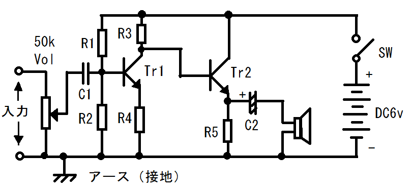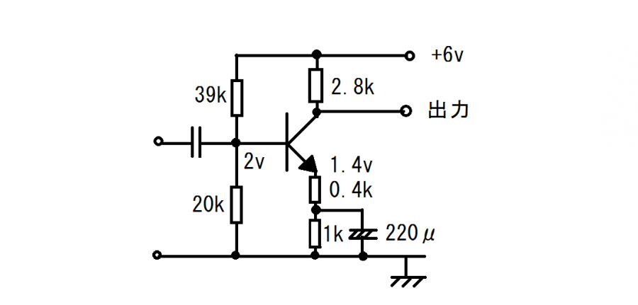 乾電池4本で6vなので、今回の回路は6vにしようと思ったのですが、これは自由にして下さい。例えば12v電源ならもっと自由に設計できると思います。6vではなかなか自由にとはいかないし、3倍の利得は無理ですね。ただ2倍程度あればフルボリュームで、かみさんにうるさいと怒られるくらいの音は出ます。ただ電源電圧を変えればR1とR2のバイアス電圧も最初から計算のやり直しになります。この辺りは面白いと言えば面白いところなのでよーく考えて試行錯誤を繰り返して下さい。利得を2倍と割り切ればR3とR4は2kと1kでもよいということになります(簡単ですね、この場合エミッタ電圧が1vなら流れる電流は1mAでコレクタ抵抗で2vの電圧降下があり、コレクタ電圧は4vということになります)。