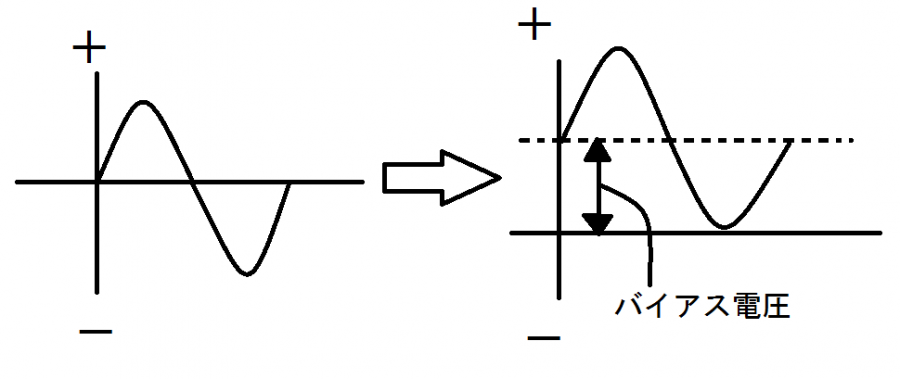 直流成分のない信号は0vを中心にして上がったり下がったりしているはずです(回路図的には右に行ったり左に行ったり)。ところでトランジスタのコレクタにはプラスの電圧がかかっており、エミッタは接地(アース)されていてます。そこでベースが低いところでプラスになったりマイナスになったりしていても十分にコレクタとエミッタ間の電流を制御することはできません、そもそもベースがマイナスではエミッタ方向にもコレクタ方向にも電流が流れようがない。それである程度エミッタに対してベースの電圧を浮かせてやらないとコレクタエミッタ間の電流をコントロールできないわけです、そこに必要になるのがベースのバイアス電圧です。これでバイアスが感性で理解できたでしょうか。