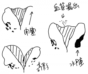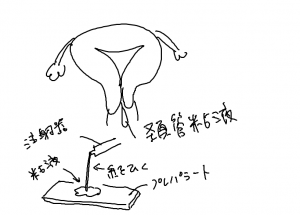 排卵のちょっと前ごろに子宮の出口の子宮経管というところの頸管腺から透明な糸を引くような粘液が出てきます。これが頸管粘液です。この中なら精子が勢いよく泳ぎまわることができます、そして子宮の中に入って行って卵管の膨大部というところで受精するのです。したがって排卵のころにこの粘液が十分出ないと精子が子宮の中に入っていけません、これを頸管因子と言って不妊の原因の一つになります。どれ位粘液が出てどうなっていればいいのかというと、0.3ml出ていて、注射器で吸って引っ張ると15㎝くらい伸びて、熱をかけて乾燥させるとシダ状の結晶ができる状態を頸管粘液が熟化していると言いいますが、そうなっていればよいです。自然妊娠のためには非常に重要なファクターと考えています、したがって、まず頸管粘液が出ているのかどうかを見ます、もし出ていないなら何とかして出さなければいけません。