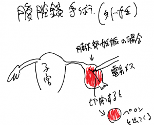 ただし、残せば妊娠した部分が完全に取りきれないで再手術する可能性が高くなり、また残した卵管にまた子宮外妊娠を起こすこともあります。状況によっては卵管を残せないこともあります、たとえば癒着がひどいときや出血がひどいとき、また卵管妊娠の場所によっても変わってきます。卵管の出口付近の妊娠は温存しやすいのですが、それ以外では温存しても再疎通率(つまりちゃんと卵管が通っている率)が低いようです。ただしおなかの中の癒着がひどかったり、きわめて緊急性が高いときなどは開腹手術になります。当院では開腹手術も腹腔鏡手術もしてませんので、子宮外妊娠を疑った時点で適切な病院をを紹介しています。