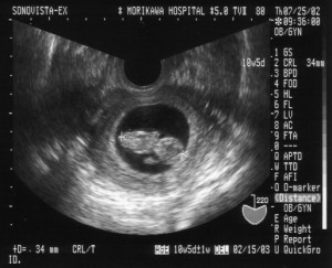 だいたいの目安として胎嚢(胎児の入っている袋)が経腟エコーで見えてくるのが妊娠5週くらい、卵黄嚢(york sacという)という丸い構造物が見えてくるのが6週くらい、胎児の心拍が見えてくるのが7週くらい、胎児が1cmになるのが8週くらい、その後は胎児の長さに7を足した程度が妊娠のだいたいの週数と言われています。最近は超音波の機械がしっかりしたグラフを元に計算してくれるのでもっとちゃんと週数がはじき出されますが、おおむねそれくらいと考えて差し支えありません。