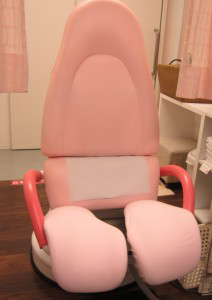 これは婦人科独自の診察で、最も皆さんが嫌がる診察だと思います。婦人科の最初の関門ですね。内診台という診察台に乗ってもらいます。最近の内診台はだいたい座れば機械が動いて寝た形になり足が広がるようにできています。当然腟の中の診察ですからズボンやパンツは脱がなくてはなりません、タオルを用意していますが、これを腰に巻き付けて内診台に座られると足が開きませんし、診察の邪魔です、タオルは内診台に座ったら前にちょっと載せる程度にして下さい。おなかの上にカーテンがかかります、普通はしめますが外国人の方にはカーテンは開けてほしいという方もおられます。