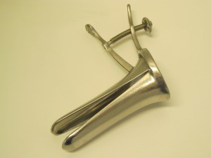腟鏡という器具を使います、鳥のくちばし(の大きなもの)のようなものを腟内入れて、それを開くと腟内が見えます、おりものや出血の状態、子宮の出口の状態などを見ます。必要があれば、子宮頚癌検診やおりものの採取、洗浄などを行います。