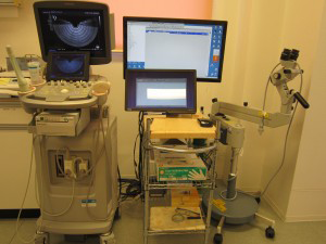 写真は当院の内診室の裏のエコーと電子カルテの画面です(その右にあるのはコルポスコープと言って子宮頚癌検診で精密検査をするときに使う機械です)。エコーを見ながら前回のエコー所見を見れるので電子カルテにしてからとても便利になりました。